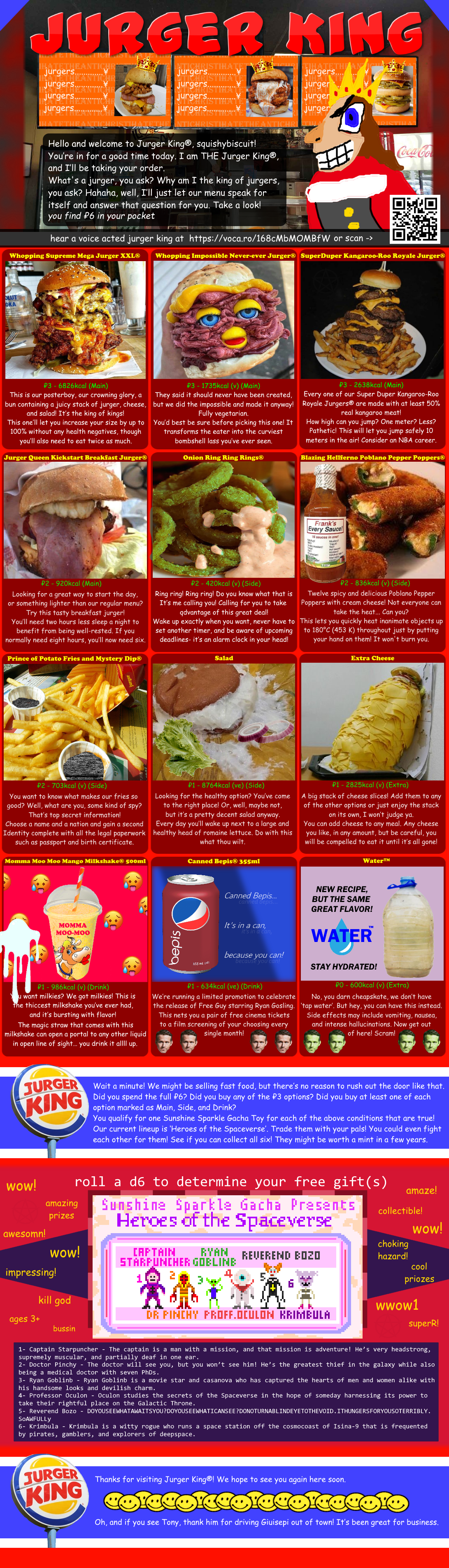 Jurger King - Proudly presenting, the most cursed CYOA ever made. Visit the Jurger King restaurant and place your order! Win gacha prizes!