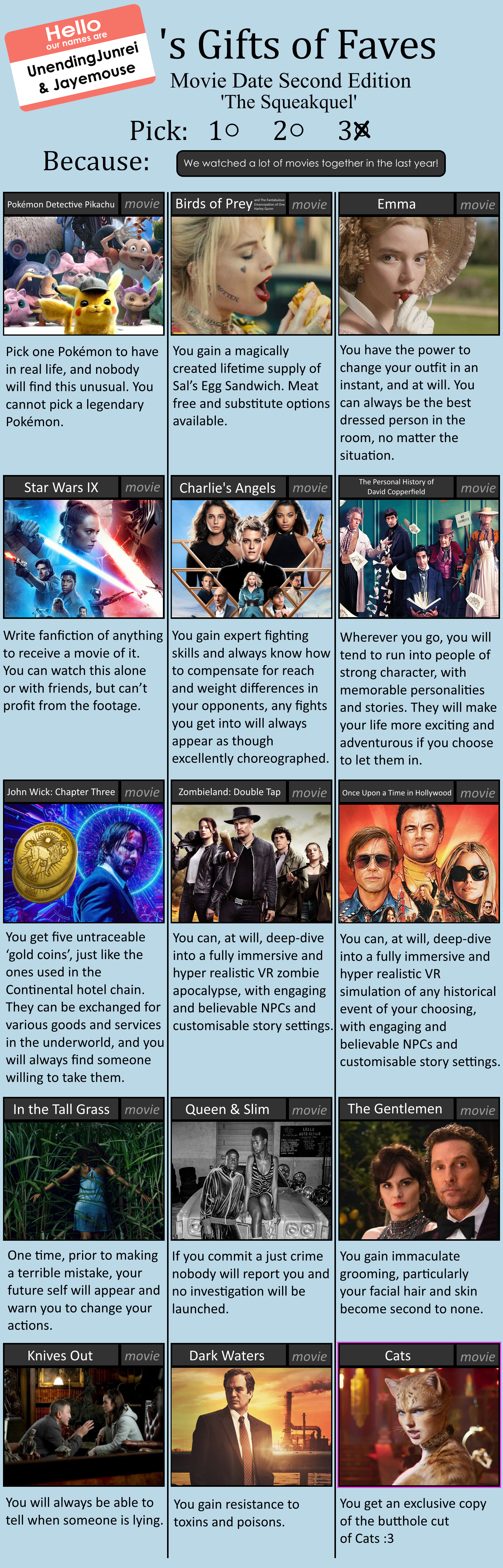 Gift of Faves - Movie Date Second Edition 'The Squeakquel' - A sequel to the original Movie Date CYOA with a larger selection of powers from movies we watched together.