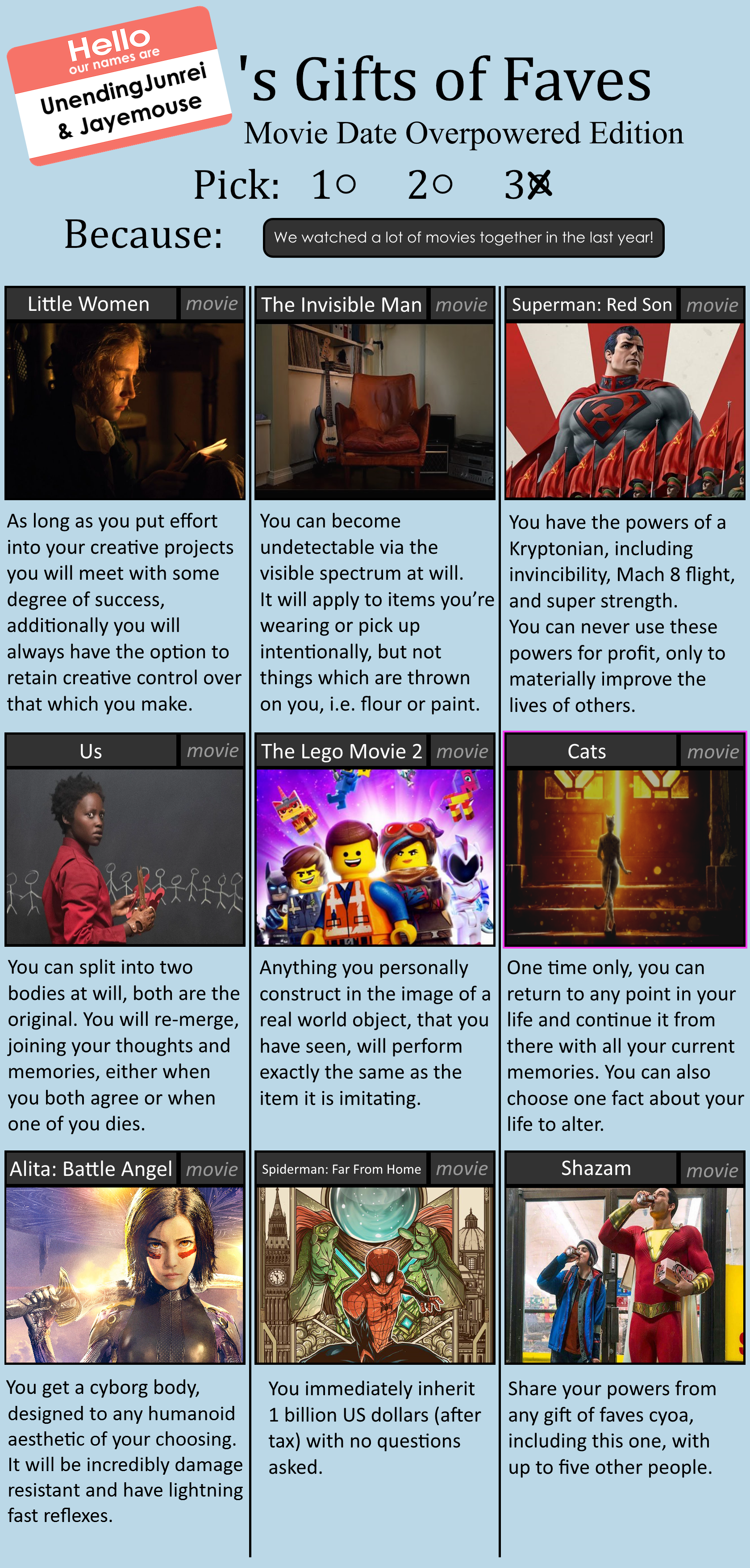 Gift of Faves - Movie Date Edition - Gain powers based on movies we watched in 2019, and specifically movies that we both enjoyed.