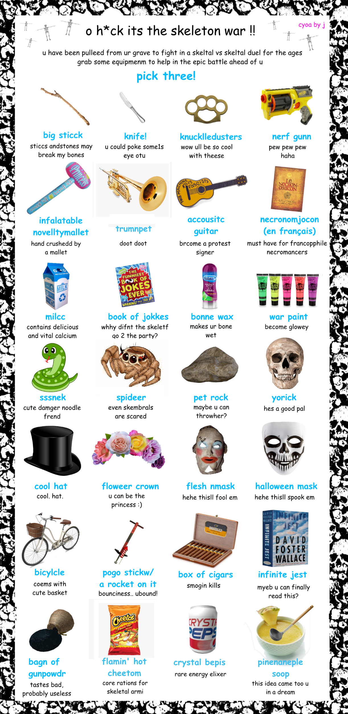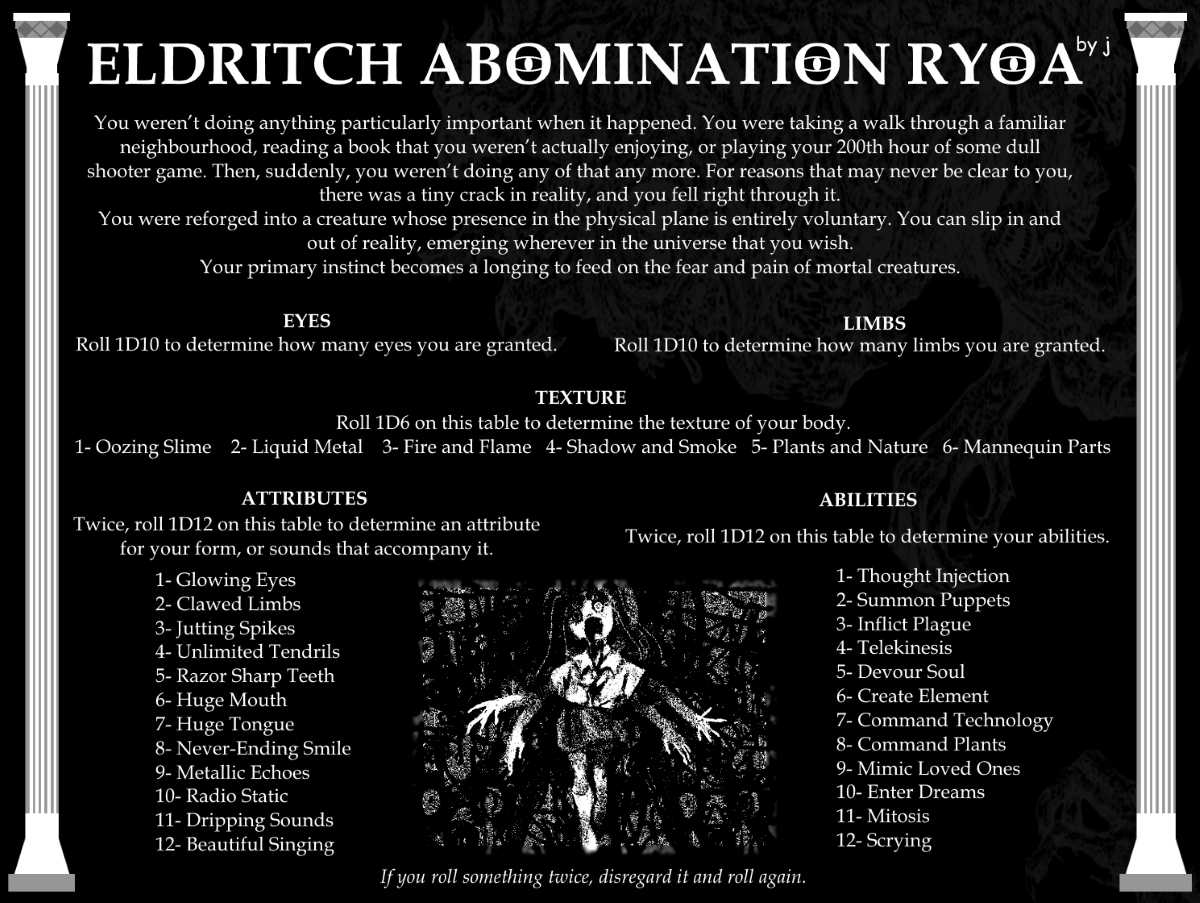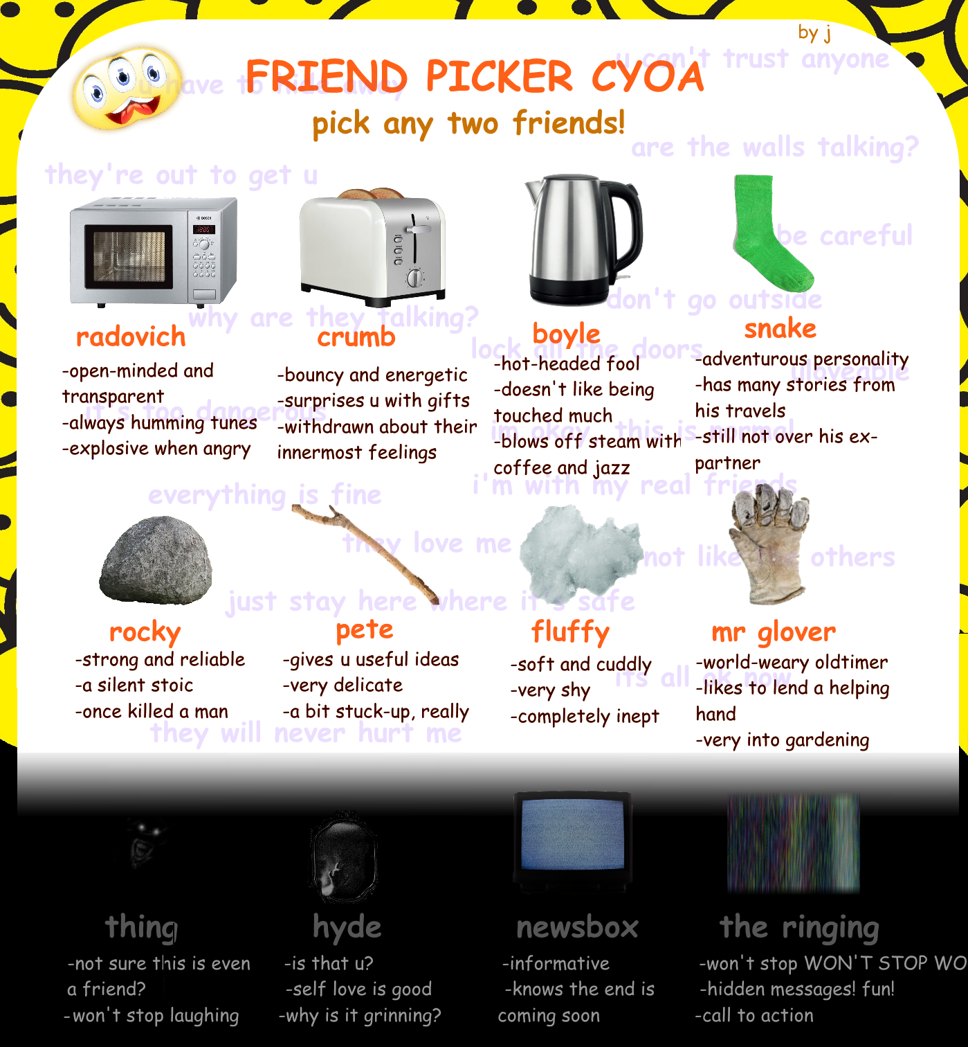 The Horror Movie CYOA [Imgchest] | [imgur] (v1.1) - Design a monster, and pick from horror movie tropes to come up with a story that you think is fun and imaginative! It's strongly inspired by movies of the 1980s, especially puppet horror movies and exploitation films. There are numbers on each option so that you can play it as RYOA if you prefer.