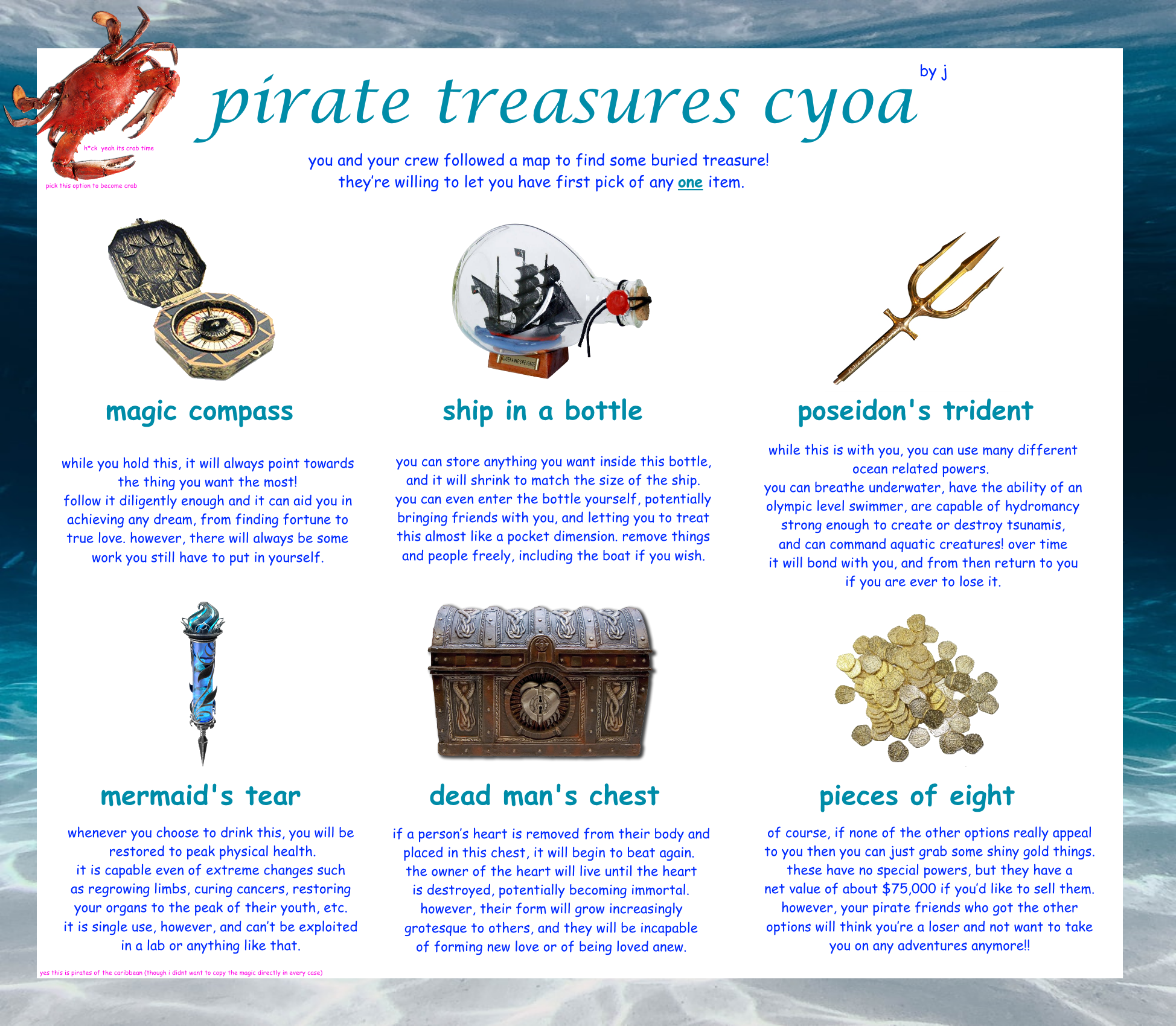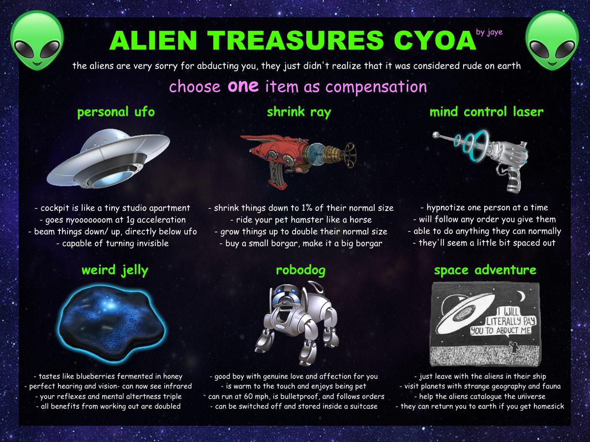 The first one, 'cosy cyoa', has been the most upvoted post of all time on the r/makeyourchoice subreddit for 4 years now.