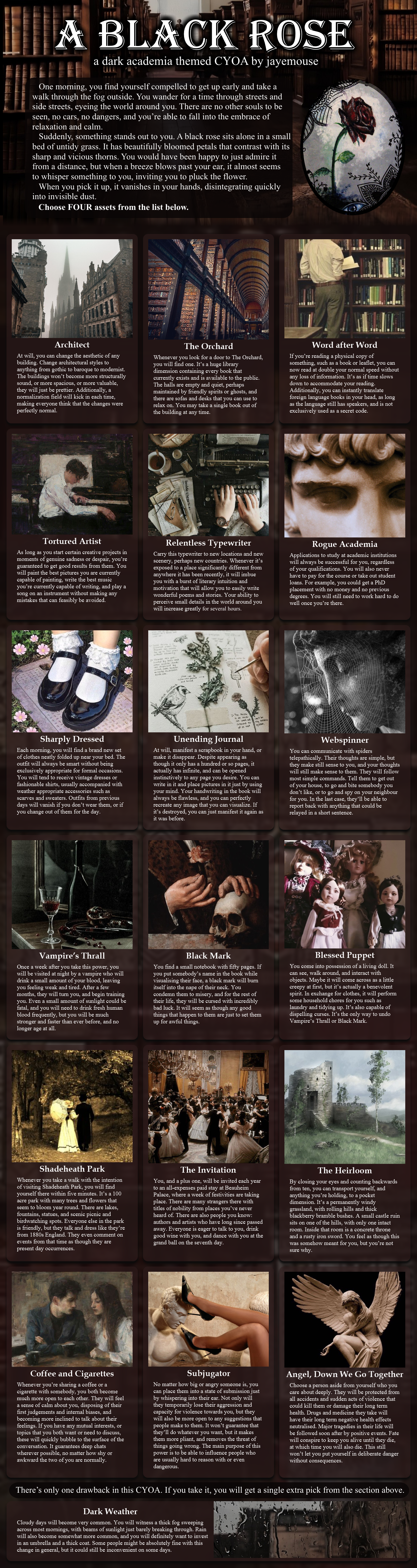 A Black Rose - Choose from a list of stylish and thematic powers related to the aesthetic of dark academia.
