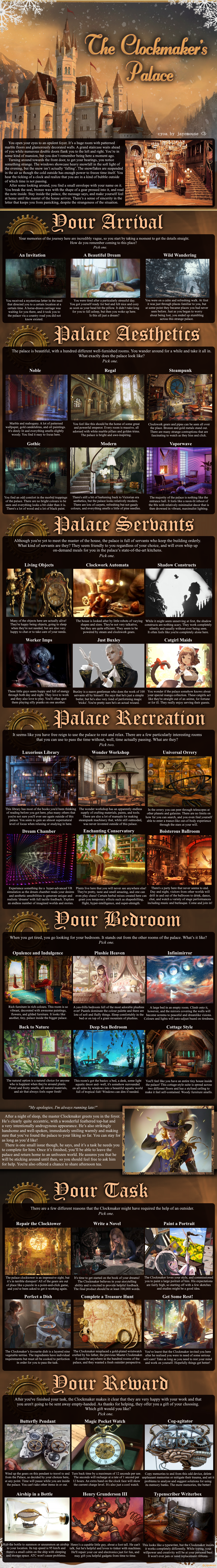 The Clockmaker's Palace - Time-stop and chill as you are whisked away to a mysterious steampunk- inspired palace for a relaxing adventure.