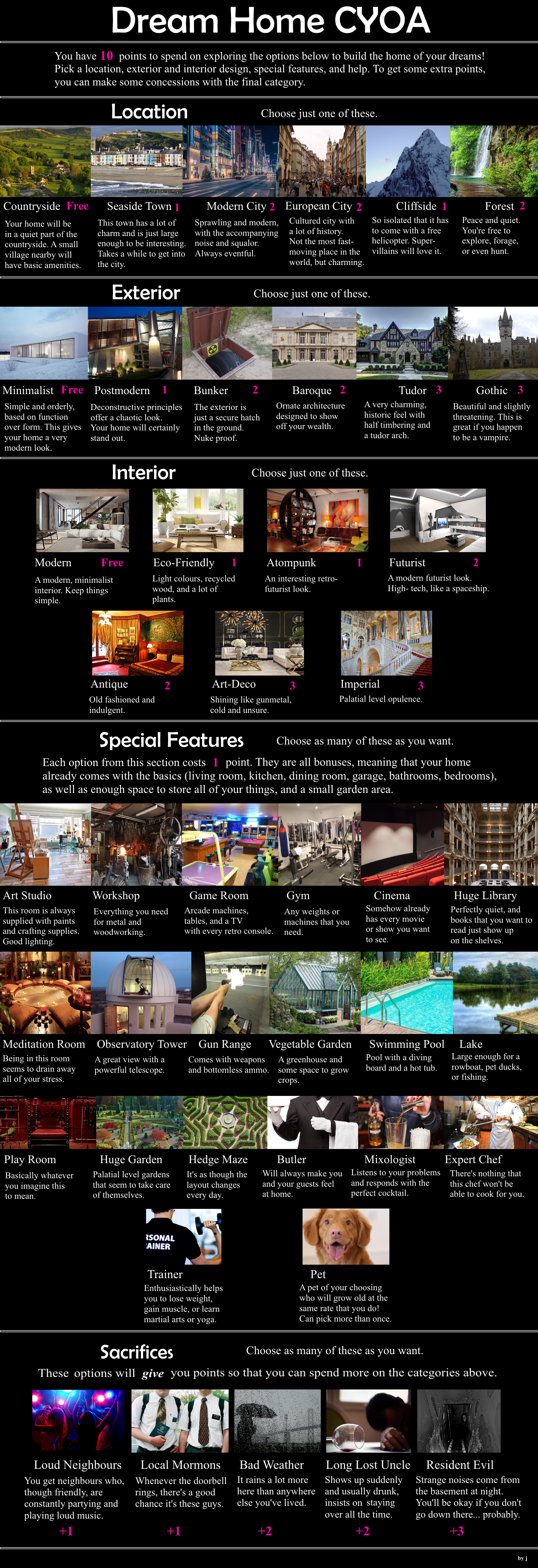 Dream Home CYOA - Build the home of your dreams! It's quick to play. Choose the location of your home, how it's designed, and what rooms you want it to include. There are very minor magic/ fantasy elements for some of the rooms.
