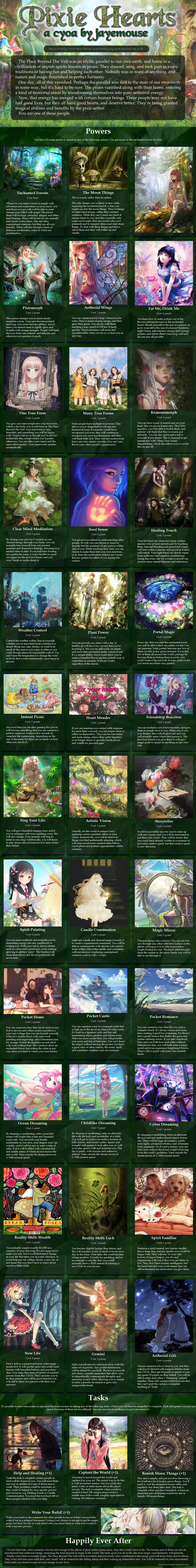 Pixie Hearts - This is a wish fulfilment fantasy with nature and cottagecore aesthetics. It's quite personal to the things that I want. You're granted powers and adventure by pixie magic, and you get to decide how it manifests!