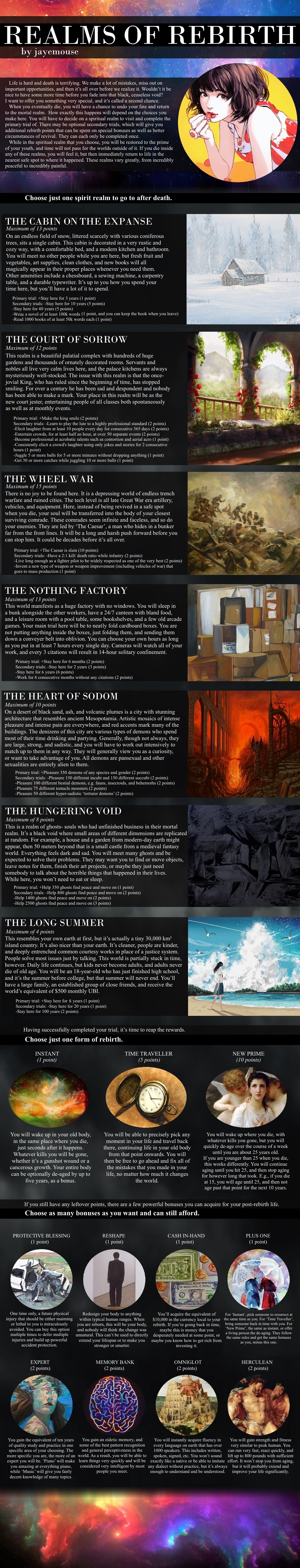 Realms of Rebirth - After you die, you have a single chance to be reborn and tie up loose ends. You will have to choose a spirit realm to visit and complete the challenges of. If you succeed, you may come back to earth a better and more powerful person.