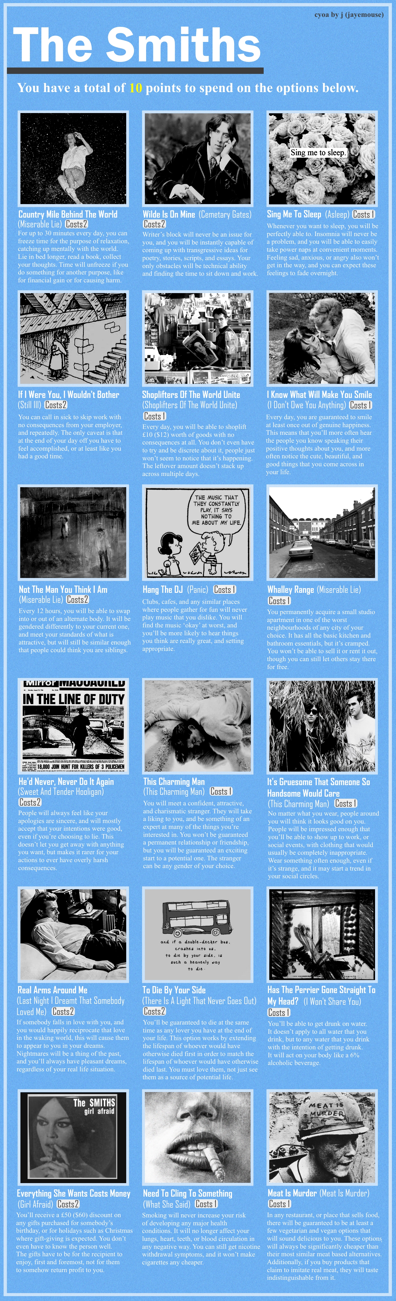 The Smiths CYOA - Spend points to gain a number of powers or improvements to your life. The aesthetic of this CYOA is based on 'The Smiths', and the options are all inspired by lyrics from their songs.